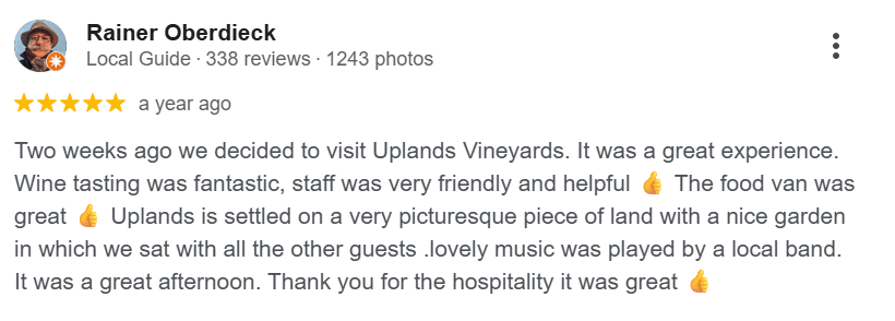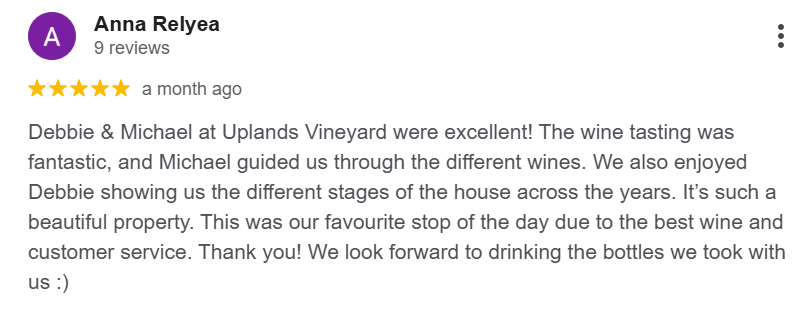 Photo Gallery & Reviews Scroll down to content Uplands Property Dark Shed (Our Off Season offering) Spring in the Vines (1st weekend in November – celebrating our new vintages) Southern Open Vineyards Weekend (annual event in March) Visitors and Events at Uplands across the years… Reviews from visitors at Uplands Vineyard Share this: Click to share on X (Opens in new window) X Click to share on Facebook (Opens in new window) Facebook Like Loading...